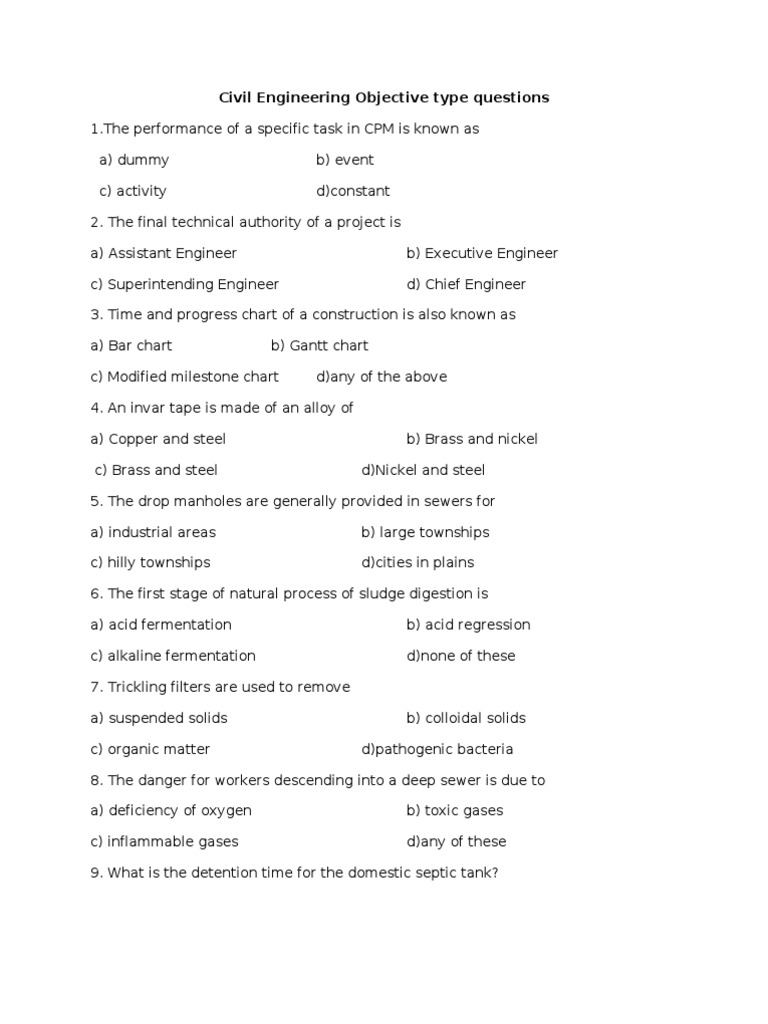 Civil engineering objective questions, civil engineering objective type questions and answers, engineering questions and answers, civil engineering test, civil engineering mcqs with answers civil ... View Document